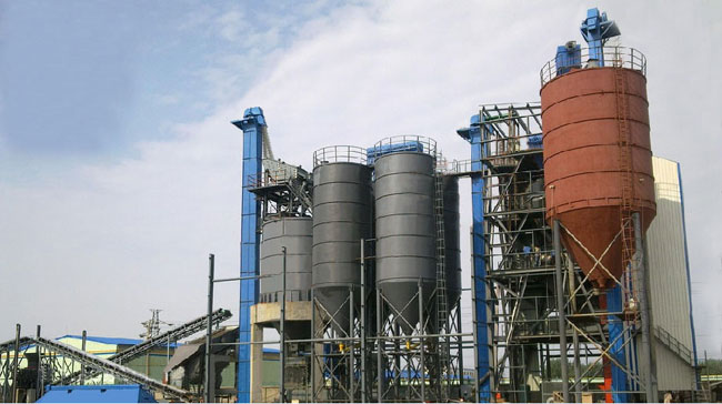 主要由提升輸送系統、計量配料系統、混合系統、儲料系統、包裝系統、除塵系統、控制系統、鋼架平臺等組成。